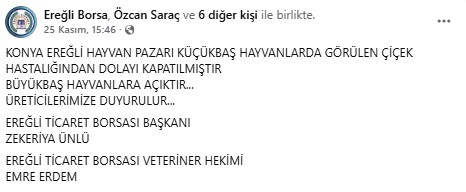Ereğli Ticaret Borsası tarafından yapılan açıklamada, "Konya Ereğli hayvan pazarı küçükbaş hayvanlarda görülen çiçek hastalığından dolayı kapatılmıştır. Büyükbaş hayvanlara açıktır. Üreticilerimize duyurulur” ifadeleri kullanıldı.