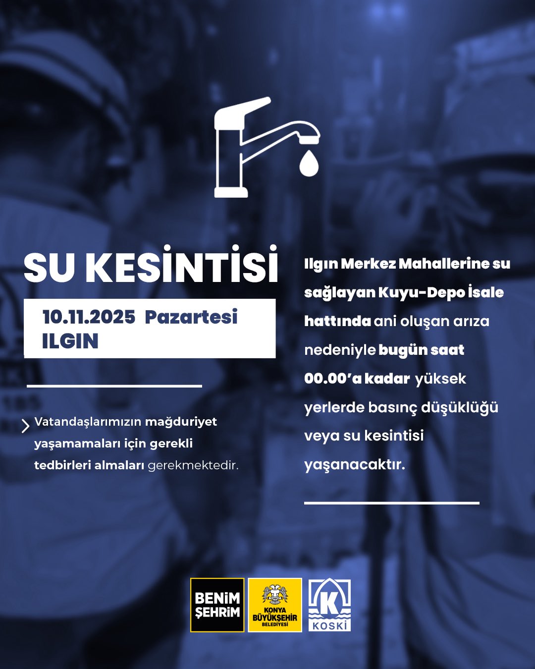 Konya Büyükşehir Belediyesi Su ve Kanalizasyon İdaresi (KOSKİ), Ilgın ilçesinde su kesintisi yaşanacağını sosyal medya hesabından duyurdu. KOSKİ, merkez mahallelere su sağlayan Kuyu-Depo isale hattında ani bir arıza meydana geldiğini bildirdi.