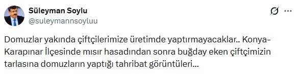 Öğretim Üyesi Süleyman Soylu, yaptığı paylaşımda domuz popülasyonundaki artışın tarımsal üretime büyük darbe vurduğunu belirtti. "Domuzlar yakında çiftçilerimize üretimde yaptırmayacaklar” ifadelerini kullanan Soylu, tarlalarda oluşan zararların boyutunun her geçen gün arttığını vurguladı.