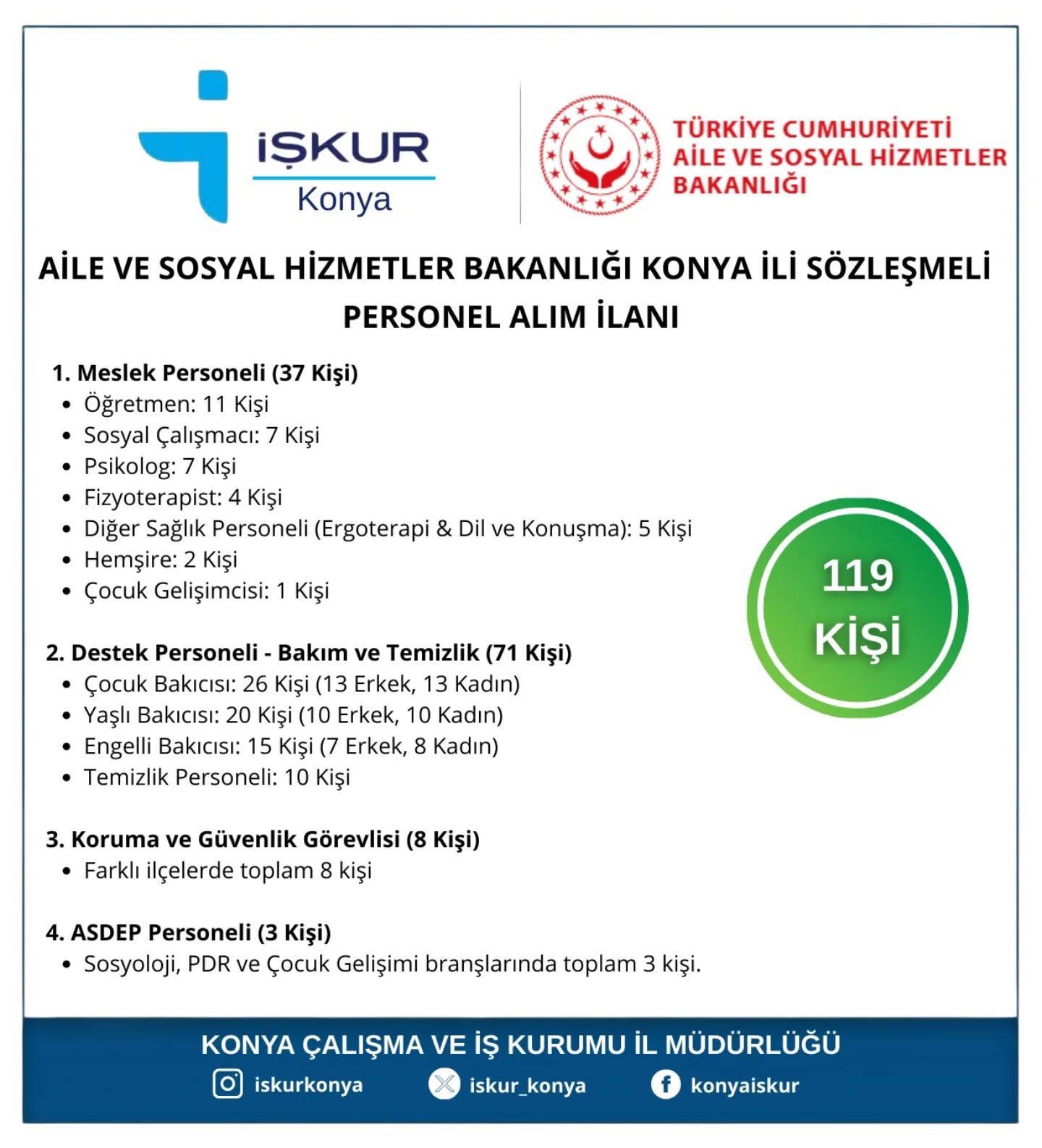 Aile ve Sosyal Hizmetler Bakanlığı Konya'ya 119 personel alacak. Yapılacak görevlendirmeler ve meslek kollarına ilişkin detaylar da ilanda yer alıyor.