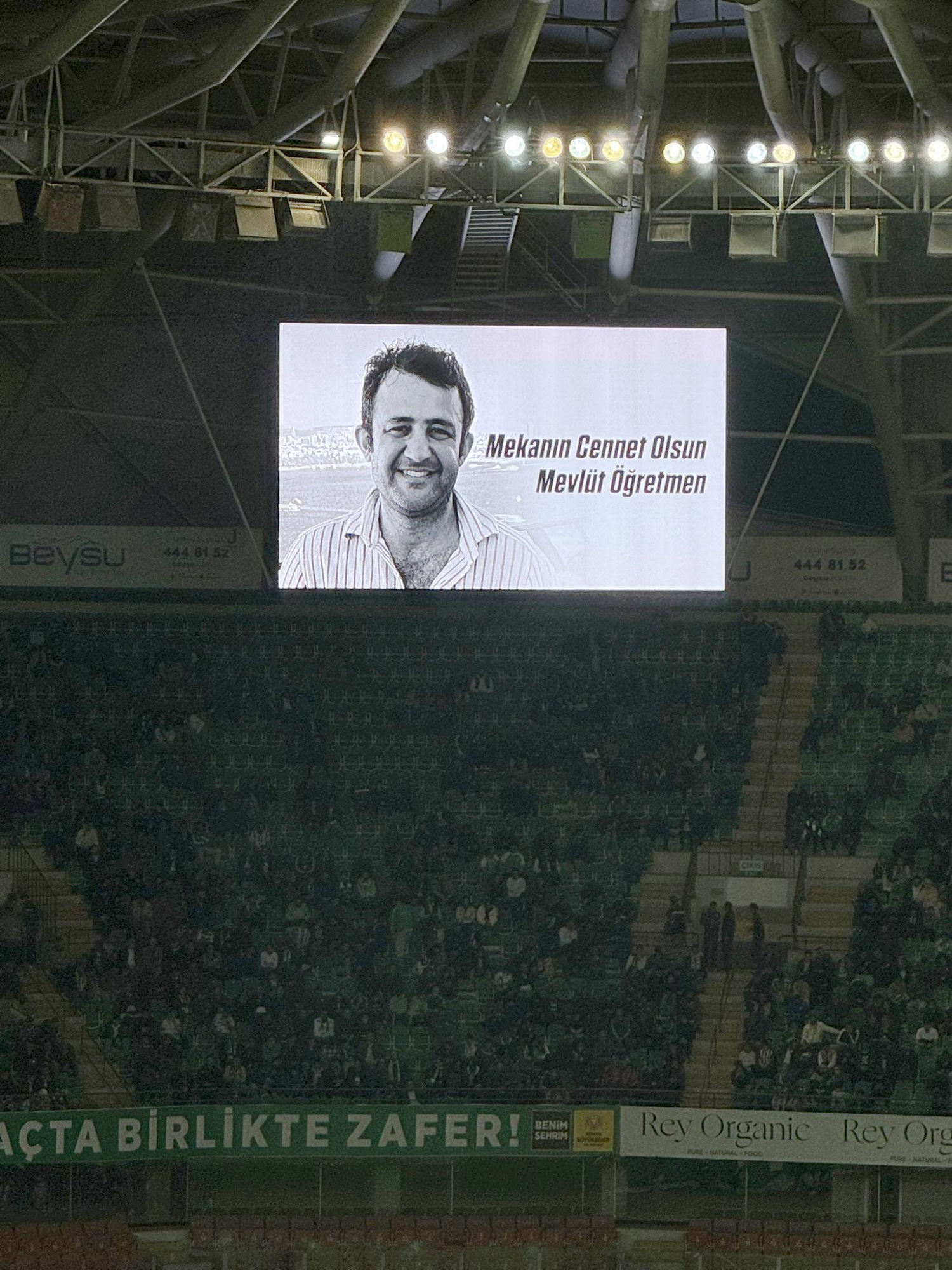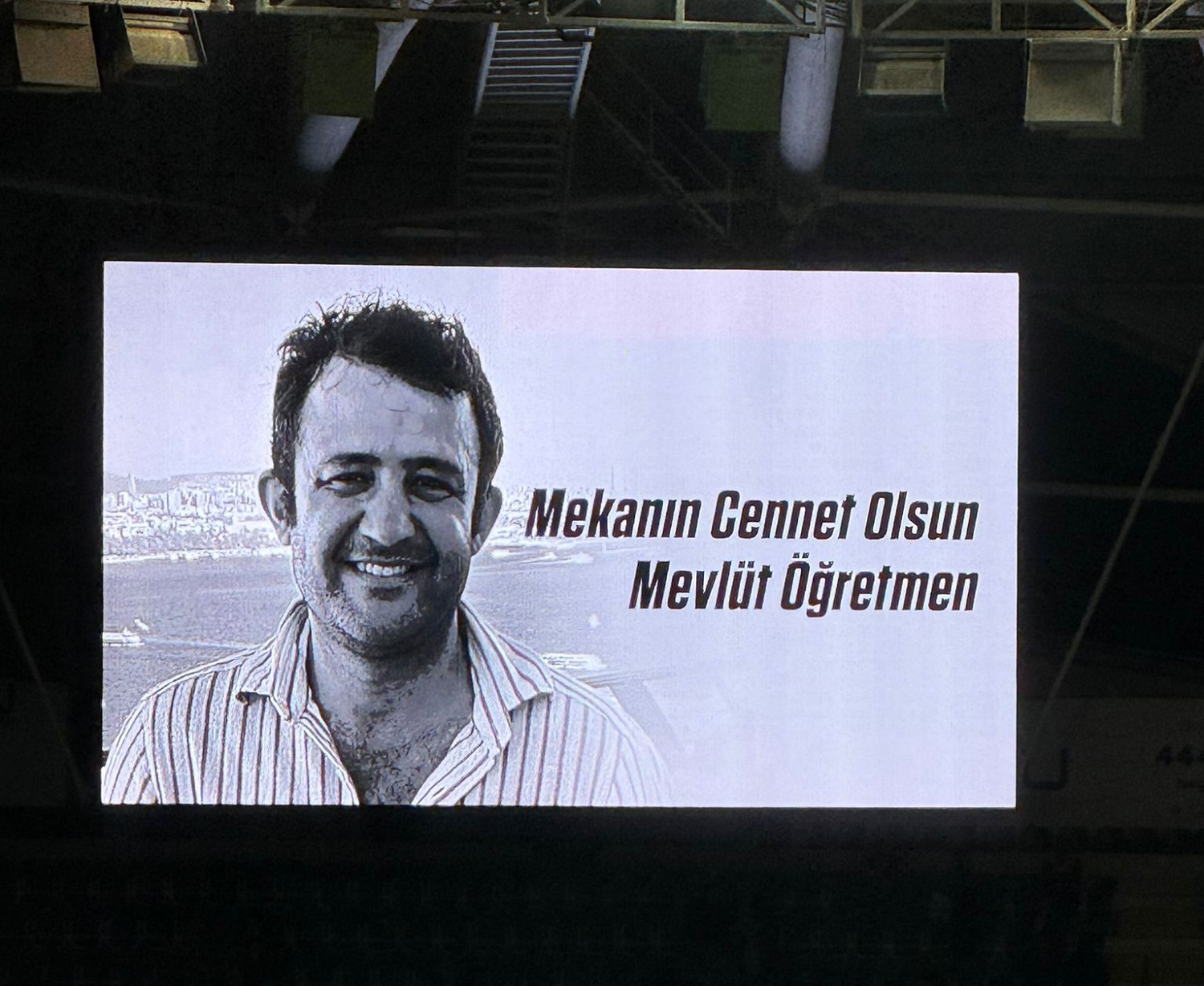 Mevlüt Külcü, stadyumdaki ekranlara da ‘Mekanın cennet olsun Mevlüt öğretmen' yazısıyla fotoğrafı yansıtılarak anıldı.