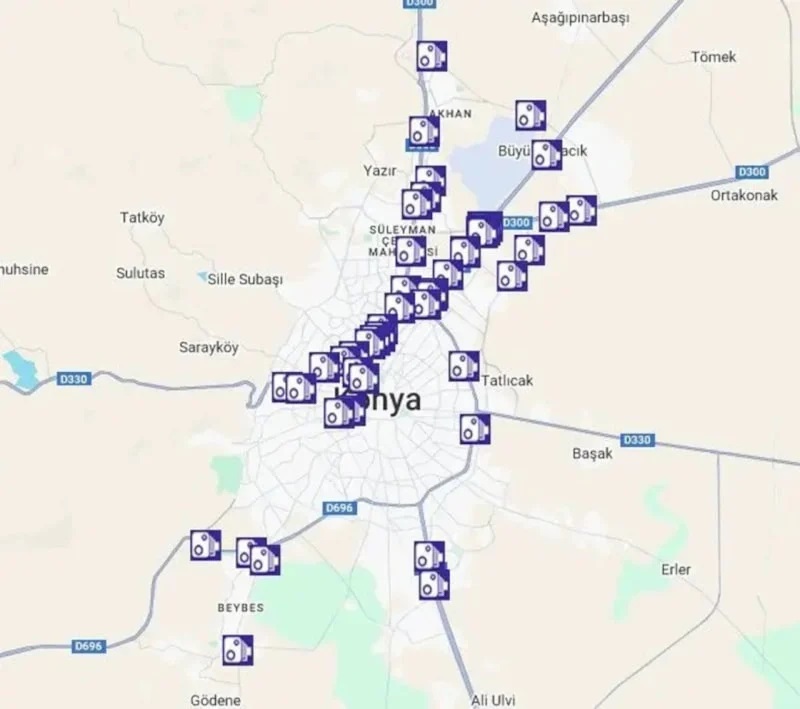 Harita Konya merkezinde ve özellikle kuzey–doğu hattındaki ana yollar üzerinde yoğunlaşmış sabit radar / EDS noktalarını gösteriyor.
