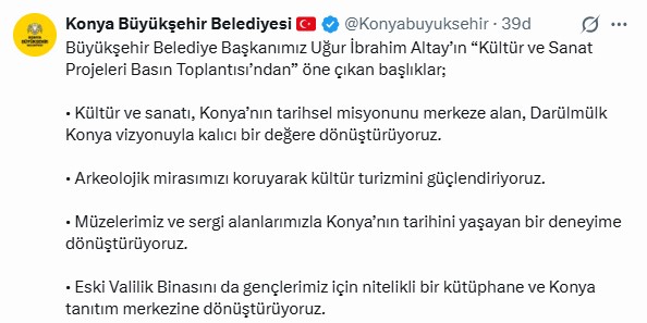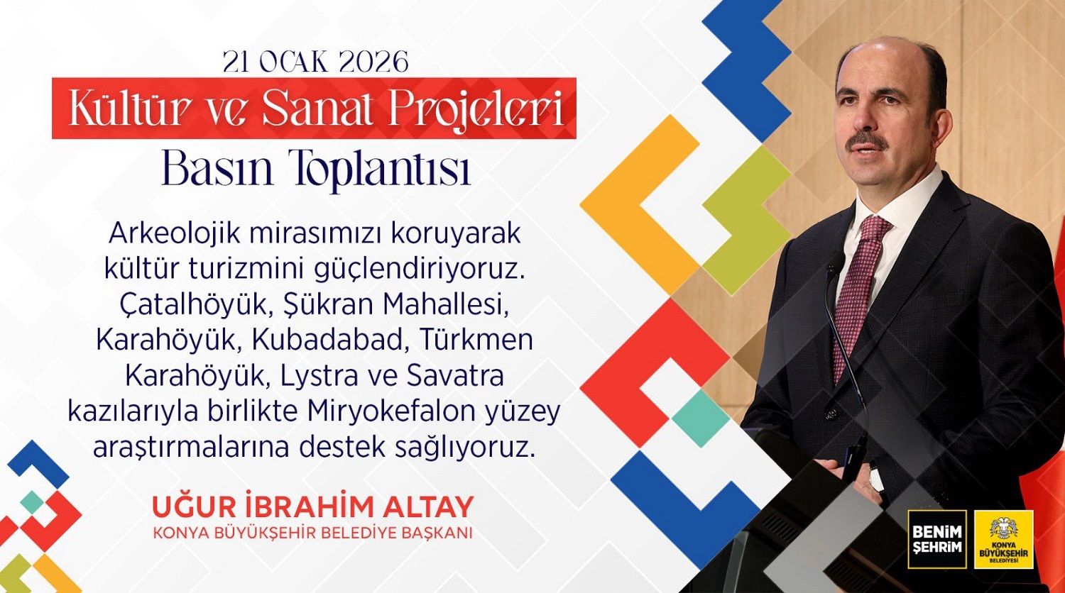 Konya Büyükşehir Belediye Başkanı Uğur İbrahim Altay, "Kültür ve Sanat Projeleri Basın Toplantısı”nda kentin kültür, sanat ve turizm vizyonuna ilişkin önemli açıklamalarda bulundu. Başkan Altay, toplantıda paylaşılan başlıkları sosyal medya hesabından da kamuoyuyla paylaştı.