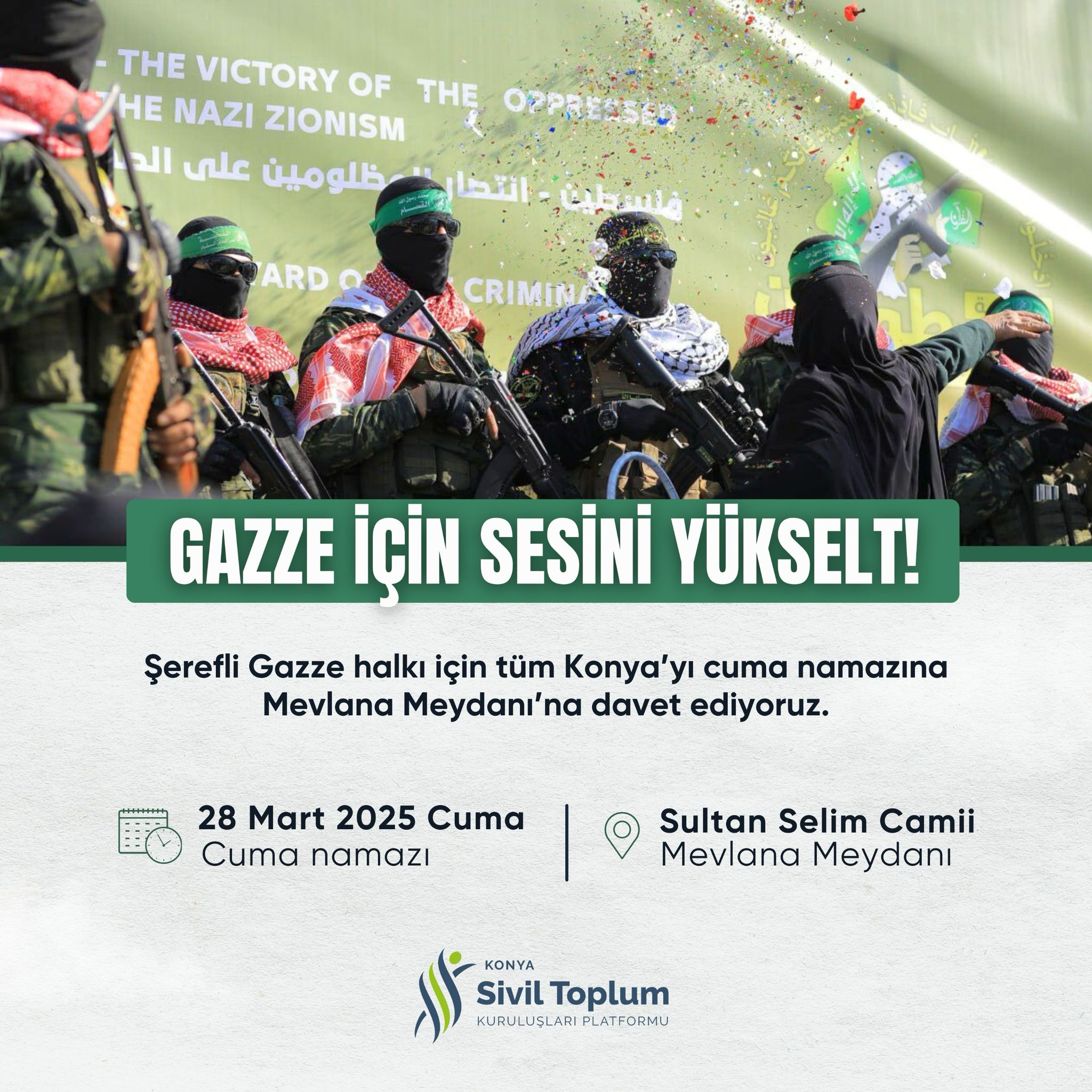 Gazze'de devam eden insani kriz karşısında Konya Sivil Toplum Kuruluşları Platformu, Filistin halkına destek vermek için Mevlana Meydanı'nda buluşacak. 28 Mart Cuma (yarın) günü gerçekleşecek etkinliğe tüm Konya halkı davet edilirken, STK'lar ayrıca Cuma namazı için de meydanda toplanmaya çağrıda bulundu.