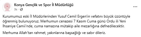 Konya Gençlik ve Spor İl Müdürlüğü tarafından yayımlanan taziye mesajında şu ifadelere yer verildi: