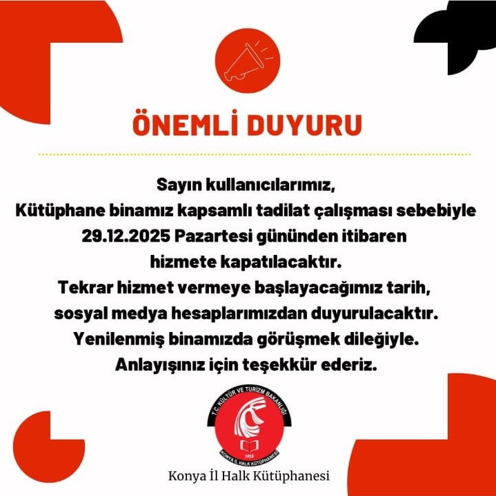 Konya'nın en önemli kültür duraklarından biri olan Konya İl Halk Kütüphanesi, modernizasyon ve iyileştirme çalışmaları kapsamında kapılarını geçici olarak kapatıyor. Kütüphane yönetimi tarafından yapılan duyuru, kütüphaneyi aktif kullanan öğrenciler ve kitapseverler arasında geniş yankı uyandırdı.
