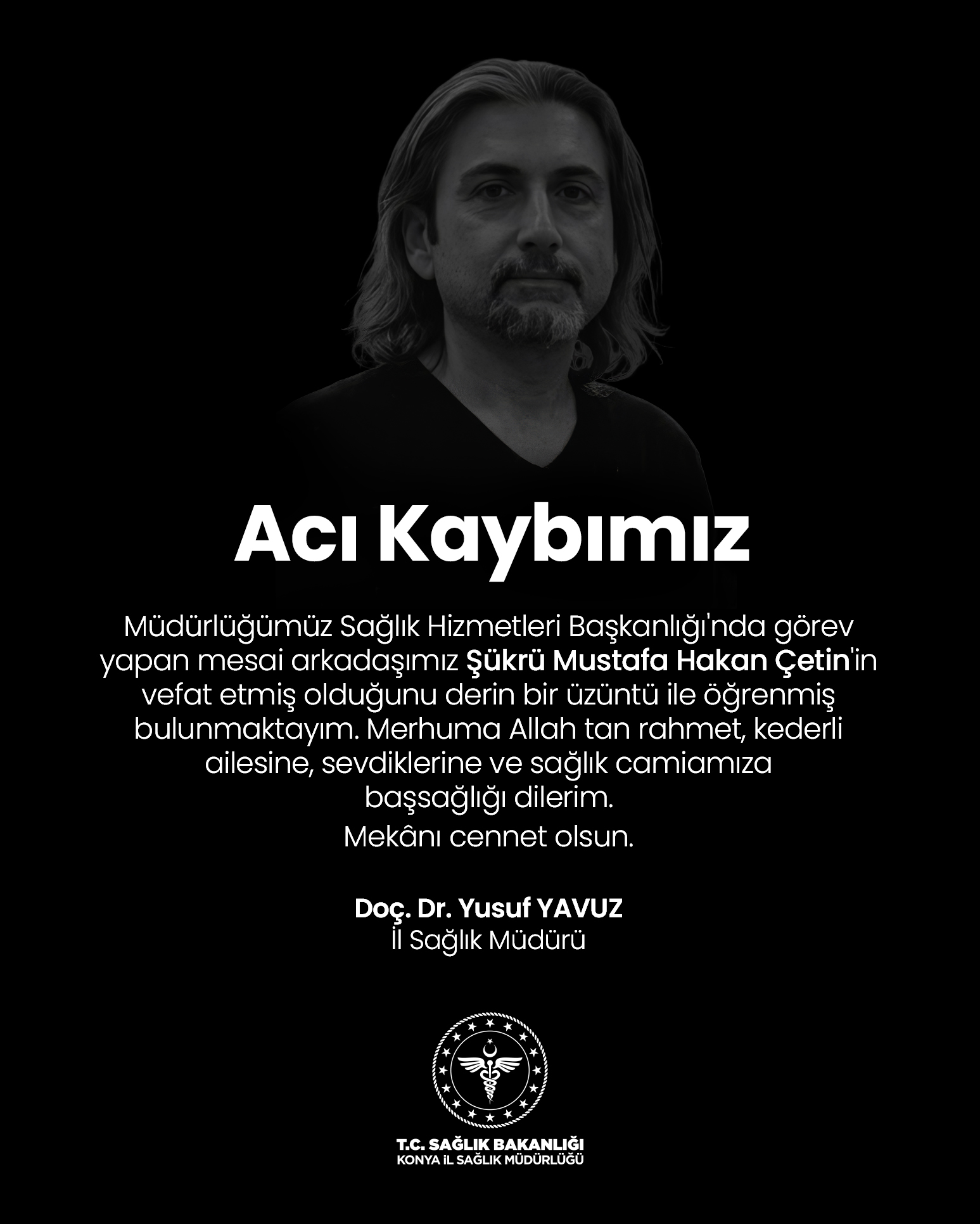Konya İl Sağlık Müdürlüğü, Sağlık Hizmetleri Başkanlığı bünyesinde görev yapan Şükrü Mustafa Hakan Çetin'in vefat haberini büyük bir üzüntüyle duyurdu. Kurum tarafından yapılan açıklamada, merhumun kaybının sağlık camiasında derin bir üzüntüye neden olduğu ifade edildi.