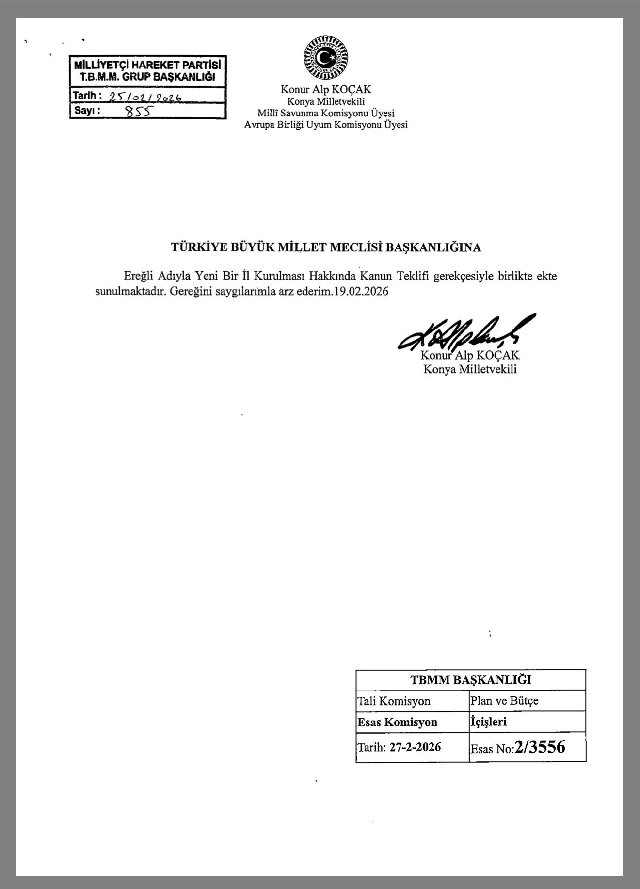 Milliyetçi Hareket Partisi (MHP) Konya Milletvekili Konur Alp Koçak, Türkiye Büyük Millet Meclisi (TBMM) Başkanlığı'na "Ereğli Adıyla Yeni Bir İl Kurulması Hakkında Kanun Teklifi”ni sundu. Teklif, Konya'nın Ereğli ilçesinin il statüsüne kavuşmasını ve bazı mahallelerin ilçe yapılmasını öngörüyor.