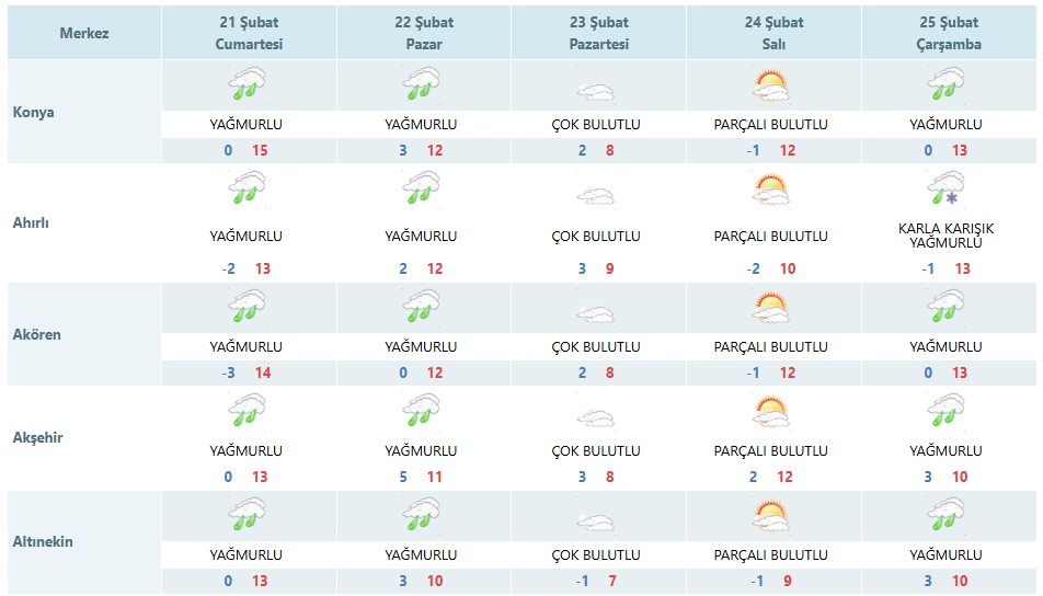 Meteoroloji verilerine göre 21 Şubat Cumartesi ve 22 Şubat Pazar günleri Konya merkezi başta olmak üzere Akşehir, Ereğli, Beyşehir, Cihanbeyli, Kulu, Karatay, Meram ve Selçuklu dahil tüm ilçelerde yağmur bekleniyor.