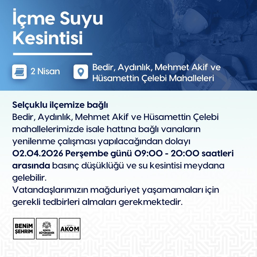 AKOM tarafından yapılan açıklamaya göre, Selçuklu ilçesine bağlı Bedir, Aydınlık, Mehmet Akif ve Hüsamettin Çelebi mahallelerinde isale hattına bağlı vanaların yenilenmesi amacıyla çalışma gerçekleştirilecek. Bu kapsamda, 2 Nisan 2026 Perşembe günü saat 09.00 ile 20.00 arasında bölgede su kesintisi ve basınç düşüklüğü yaşanabileceği bildirildi.