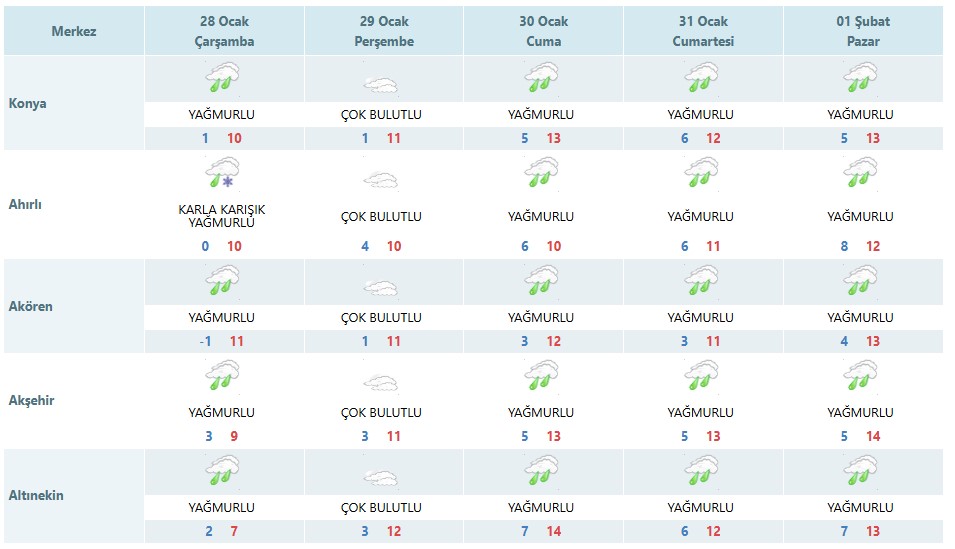 Meteoroloji Genel Müdürlüğü, Konya'nın merkez ilçeleri dahil olmak üzere 31 ilçeyi kapsayan beş günlük hava tahmin raporunu yayımladı. Rapora göre, 28 Ocak Çarşamba gününden itibaren 1 Şubat Pazar gününe kadar Konya genelinde yağışlı ve yer yer karla karışık yağmurlu hava etkili olacak.