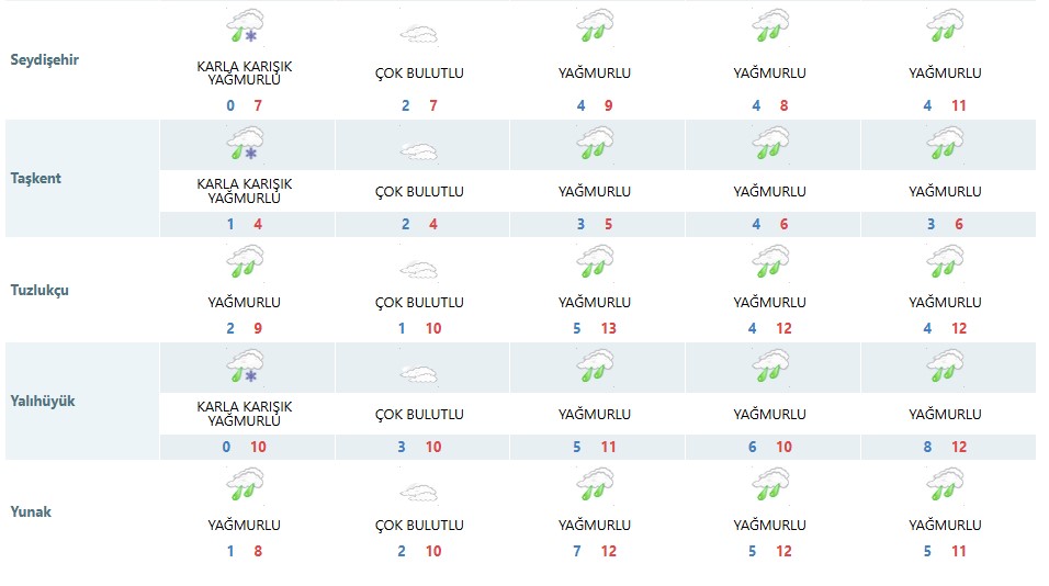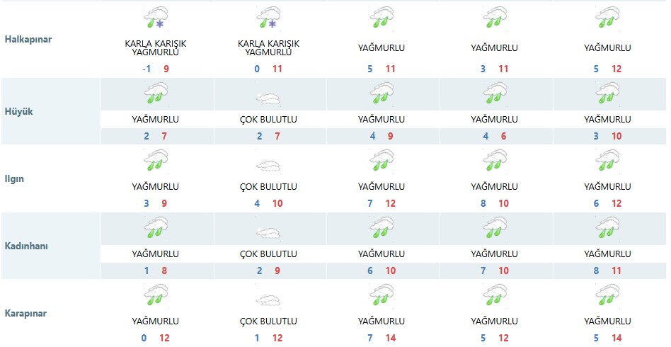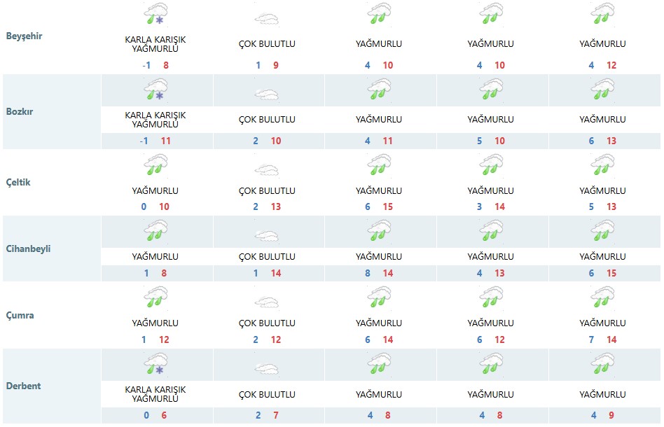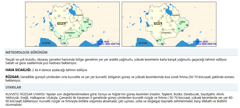 Tahminlere göre, 28 Ocak Çarşamba günü Ahırlı, Beyşehir, Bozkır, Derbent, Hadim, Halkapınar, Seydişehir, Taşkent ve Yalıhüyük ilçelerinde karla karışık yağmur bekleniyor. Bu ilçeler dışındaki bölgelerde ise yağmur şeklinde yağışın etkili olacağı bildirildi. Yetkililer, özellikle yüksek kesimlerde sürücülerin dikkatli olması konusunda uyarıda bulundu.