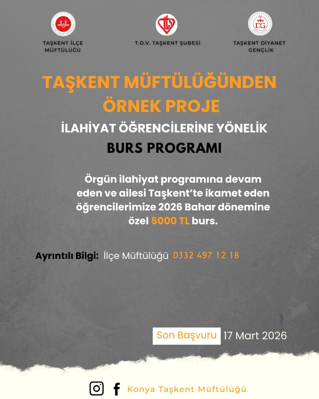 Konya'nın Taşkent ilçesi müftülüğü, örgün ilahiyat programında eğitim gören ve ailesi ilçede ikamet eden öğrenciler için 2026 yılı bahar dönemi burs başvurularının başladığını duyurdu. Müftülük tarafından yapılan açıklamada, ilahiyat alanında eğitim alan öğrencilerin desteklenmesi amacıyla verilen 5000 TL burs için başvuru sürecinin başlatıldığı belirtildi.