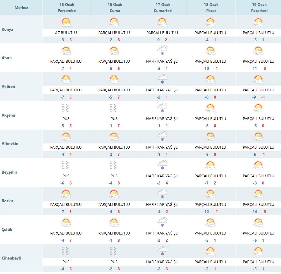Meteoroloji Genel Müdürlüğü'nden alınan bilgilere göre Konya için 5 günlük hava durumu tahmini:
