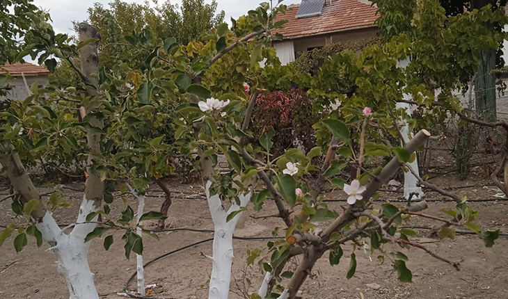 ilçeye bağlı Kozanlı Mahallesi'nde bir kişiye ait müstakil evin bahçesinde bulunan elma ağacı, mevsim normallerinin dışında yeniden çiçeklendi.