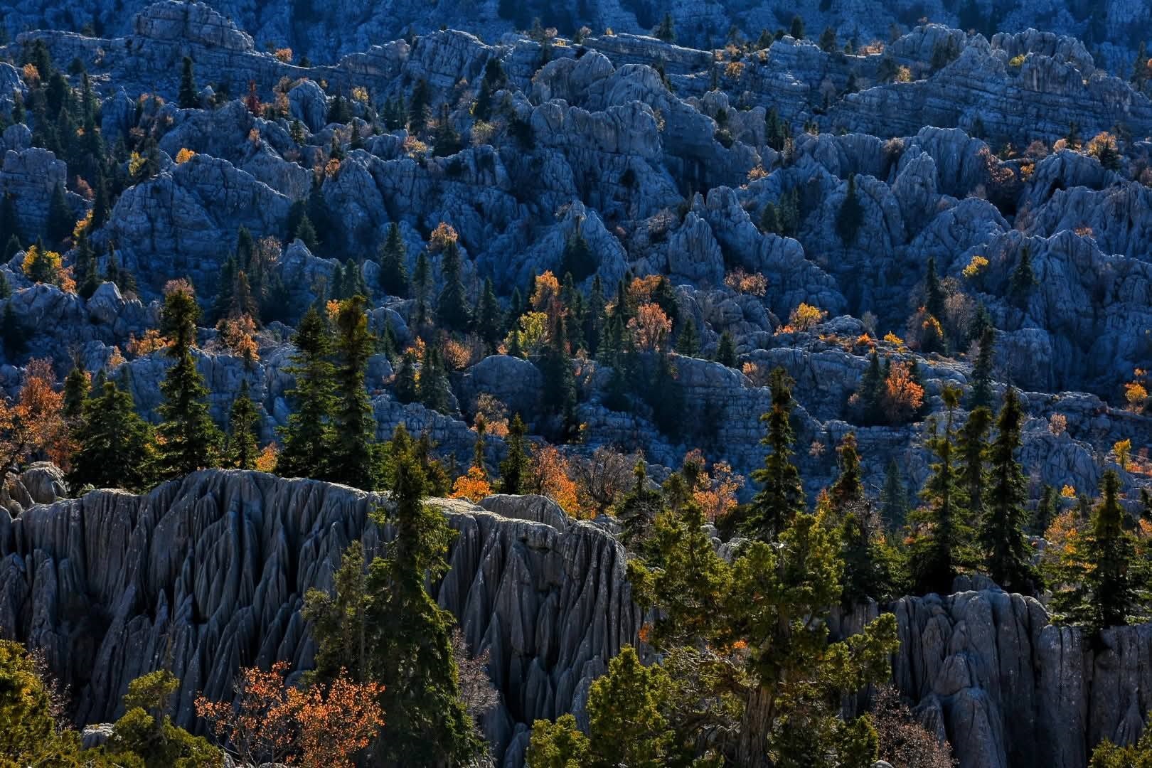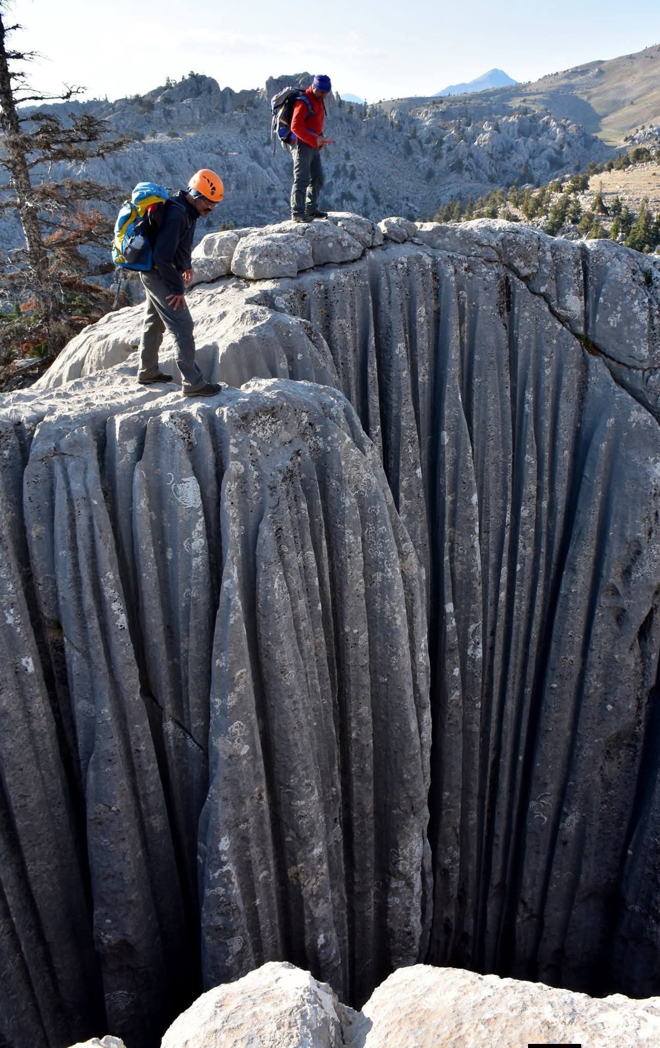 Antalya'nın Akseki ilçesiyle Konya'nın Seydişehir ilçesi sınırlarındaki Giden Gelmez Dağları, 100 metreyi bulan uçurumları, dikey mağaraları ve obruklarıyla oluşturduğu zorlu coğrafi şartlarıyla dikkat çekiyor. Yaban hayatının da zengin olduğu bölgedeki önemli doğa gezgini ve dağcılardan biri olan Mustafa Ünal, keskin kayalıklardan oluşan tehlikeli çukurları görüntüledi.