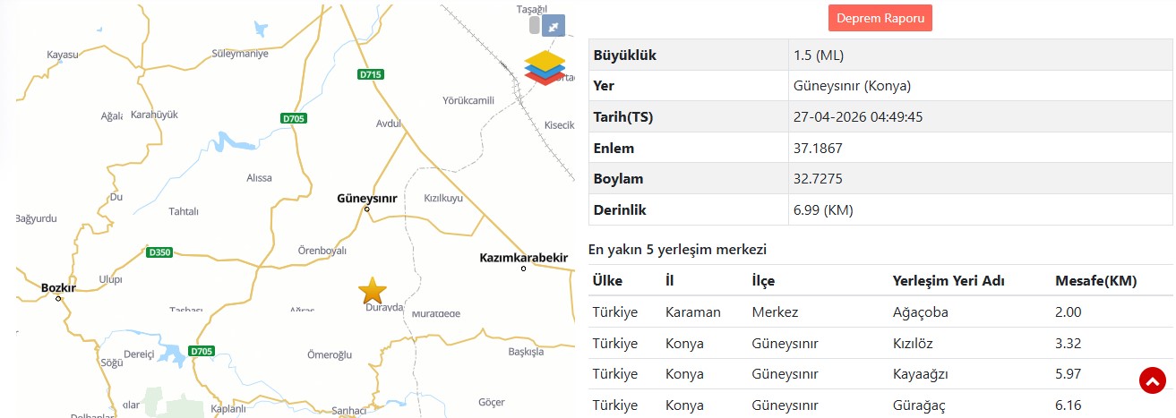 Konya'nın güney ilçelerinden Güneysınır'da sabah erken saatlerde meydana gelen deprem, kısa süreli paniğe neden oldu.