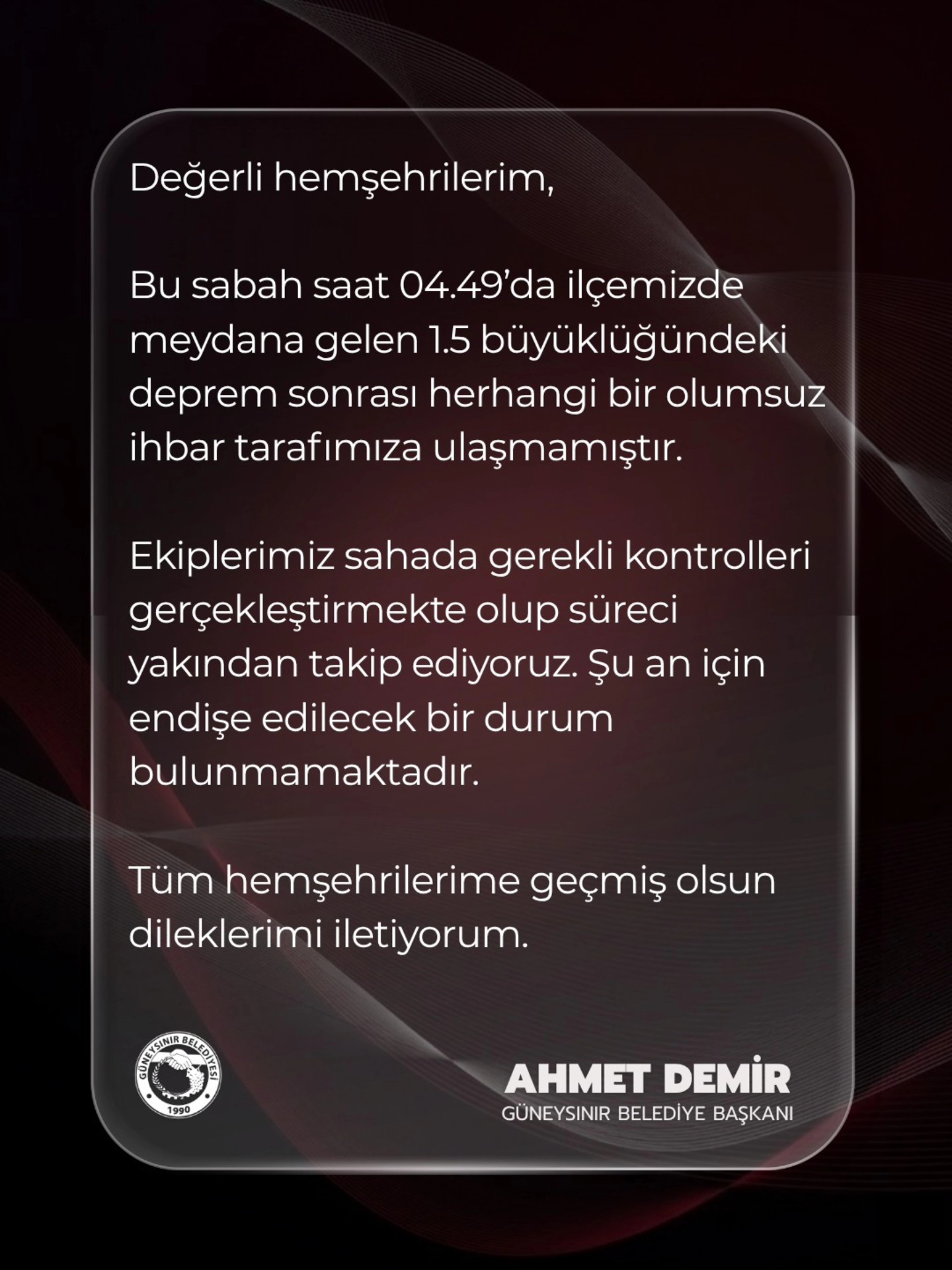 Güneysınır Belediye Başkanı Ahmet Demir yaptığı açıklamada, "Bu sabah saat 04.49'da ilçemizde meydana gelen 1.5 büyüklüğündeki deprem sonrası herhangi bir olumsuz ihbar tarafımıza ulaşmamıştır. Ekiplerimiz sahada gerekli kontrolleri gerçekleştirmekte olup süreci yakından takip ediyoruz. Şu an için endişe edilecek bir durum bulunmamaktadır. Tüm hemşehrilerimize geçmiş olsun dileklerimi iletiyorum.” ifadelerini kullandı.