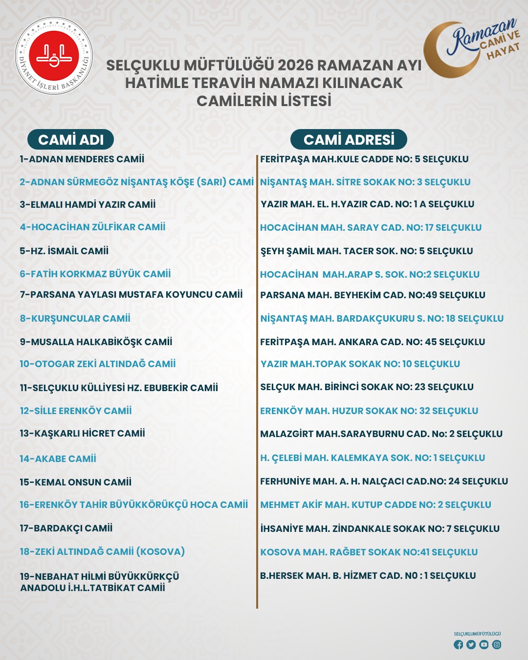 Selçuklu genelinde hatimle teravih namazı kılınacak camiler şu şekilde açıklandı: