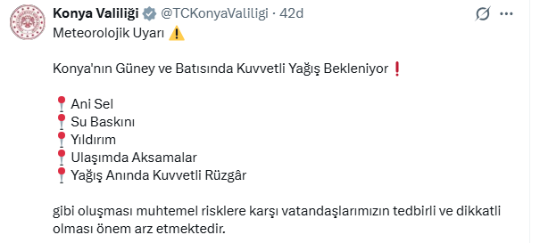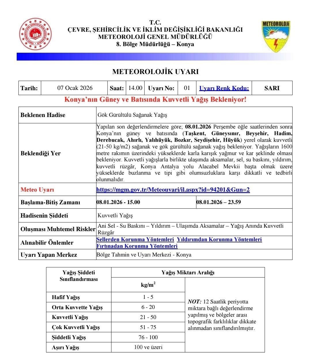 Konya Valiliği paylaşımındaki uyarı Taşkent, Güneysınır, Beyşehir, Hadim, Derebucak, Ahırlı, Yalıhüyük, Bozkır, Seydişehir ve Hüyük ilçelerini kapsıyor. Yağışların yerel olarak kuvvetli (21–50 kg/m²) olacağı tahmin edilirken, 1600 metre ve üzerindeki yüksek kesimlerde yağmurun karla karışık yağmur ve yer yer kar şeklinde görülebileceği bildirildi.