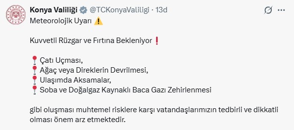 Konya Valiliği, sosyal medya hesabı üzerinden kuvvetli rüzgar ve fırtına uyarısında bulunarak vatandaşları dikkatli olmaya çağırdı.