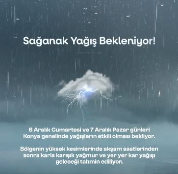 "Yer Yer Sağanak Yağış Bekleniyor! 6 Aralık Cumartesi ve 7 Aralık Pazar günleri Konya genelinde yağışların etkili olması bekleniyor. Bölgenin yüksek kesimlerinde ise akşam saatlerinden sonra karla karışık yağmur ve yer yer kar yağışı görüleceği tahmin ediliyor. Meteorolojik koşullara karşı vatandaşlarımızın tedbirli ve dikkatli olması önemle rica olunur.'' İfadelerini kullandı.