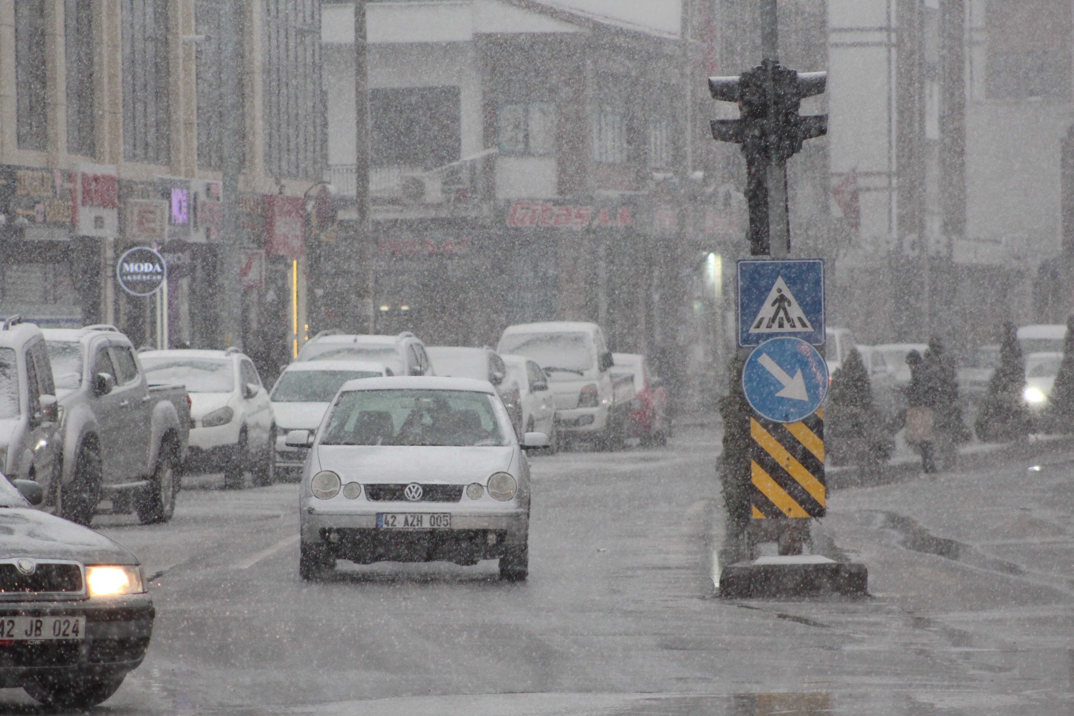Karapınar'da sabah saatlerinde başlayan yağmur yağışı yerini kar yağışına bırakarak etkisini artırdı. İlçe, beyaz bir örtüyle kapladı.