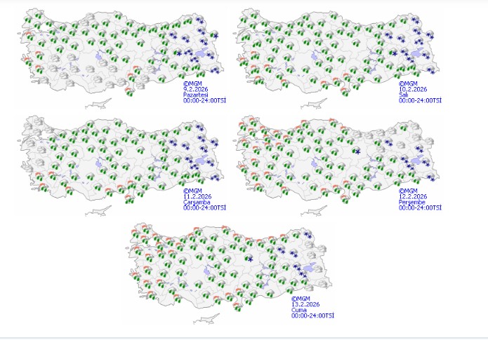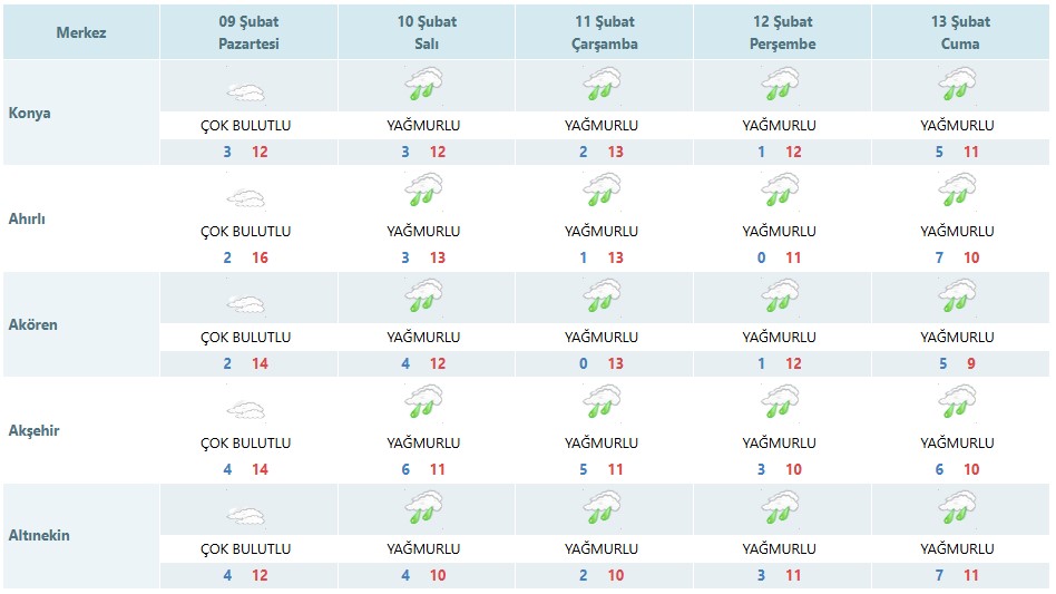 Bugün Konya genelinde bulutlu bir hava hakim olurken, 10 Şubat Salı günü itibarıyla 13 Şubat Cuma gününe kadar yağışların etkisini göstermesi bekleniyor. Yağışların il genelinde aralıklarla devam edeceği tahmin ediliyor.