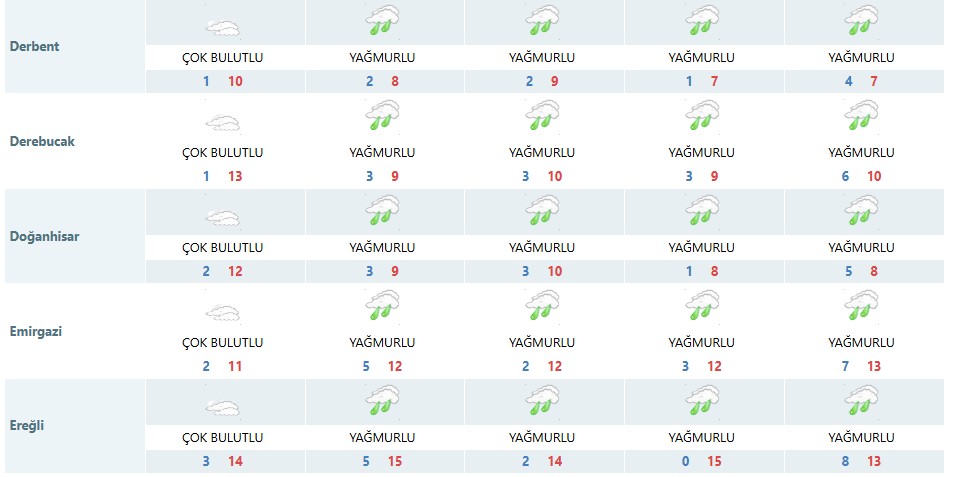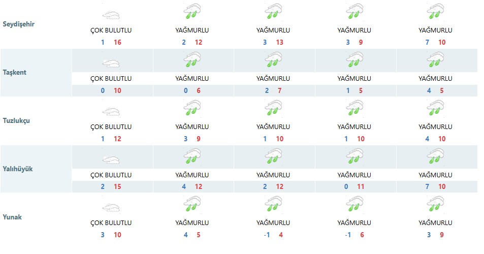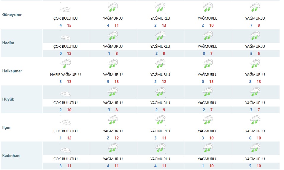 Meteoroloji Genel Müdürlüğü, Konya'nın merkez ilçesi dahil olmak üzere 31 ilçesi için beş günlük hava tahmin raporunu yayımladı. Rapora göre, bugün hariç haftanın son gününe kadar kent genelinde yağışlı hava etkili olacak.