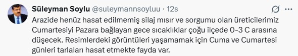 Soylu, paylaşımında Cumartesiyi Pazara bağlayan gece Konya'nın birçok ilçesinde sıcaklıkların 0 ile 3 derece arasına düşmesinin beklendiğini ifade etti. Bu durumun, özellikle tarlada henüz hasat edilmemiş silaj mısır ve sorgum bitkileri için don riski oluşturduğuna dikkat çekti.
