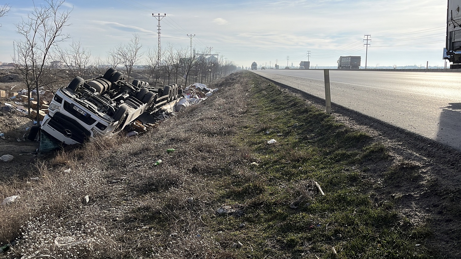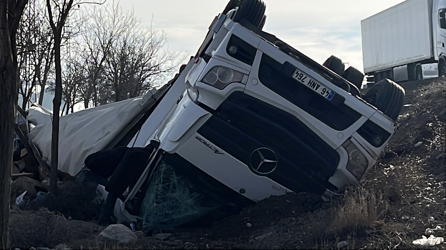 Edinilen bilgiye göre, Konya istikametine doğru seyir halinde olan E.Ö. idaresindeki 46 ANH 764 plakalı Mercedes marka tır, sürücüsünün direksiyon hakimiyetini kaybetmesi sonucu şarampole devrildi.