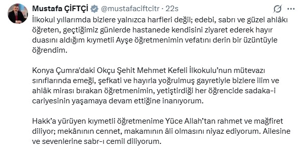 Çiftçi mesajında, "İlkokul yıllarımda bizlere yalnızca harfleri değil; edebi, sabrı ve güzel ahlâkı öğreten, geçtiğimiz günlerde hastanede kendisini ziyaret ederek hayır duasını aldığım kıymetli Ayşe öğretmenimin vefatını derin bir üzüntüyle öğrendim.