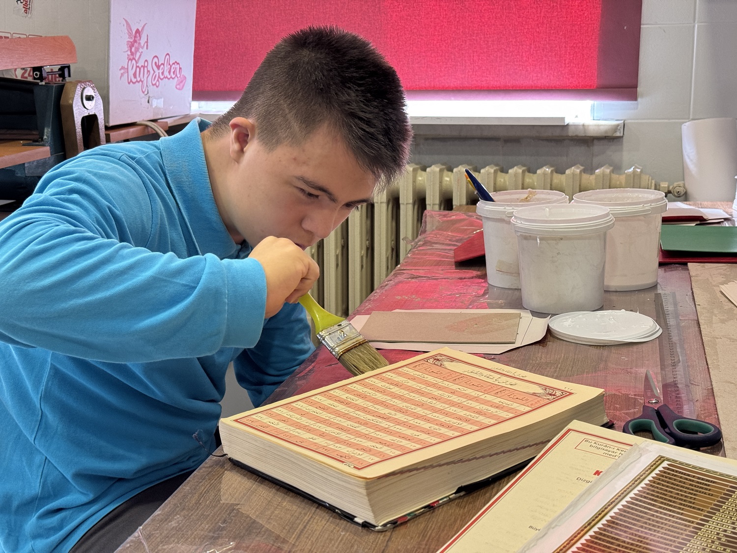 Öğretmenlerinin üzerine titrediği Harun Efe, geleneksel Türk İslam sanatında ciltlemeyi de öğreniyor. Bu alanda 3 aydır eğitim alan Türk, mahalleden getirilen yıpranmış Kur'an-ı Kerim'in cilt ve kapağını yeniledi.