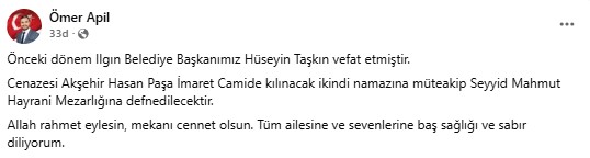 Acı haberi, Konya Ilgın Belediye Başkanı Ömer Apil kamuoyuna duyurdu. Taşkın'ın vefatı, hem Ilgın'da hem de onu tanıyanlar arasında derin bir üzüntüyle karşılandı.