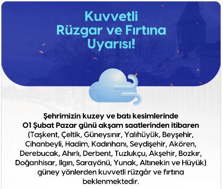 Konya AKOM, 1 Şubat Pazar akşamı başlayacak kuvvetli rüzgar ve fırtına nedeniyle şehrin kuzey ve batı kesimlerini uyardı. Vatandaşların olumsuzluklara karşı tedbirli olması istendi.