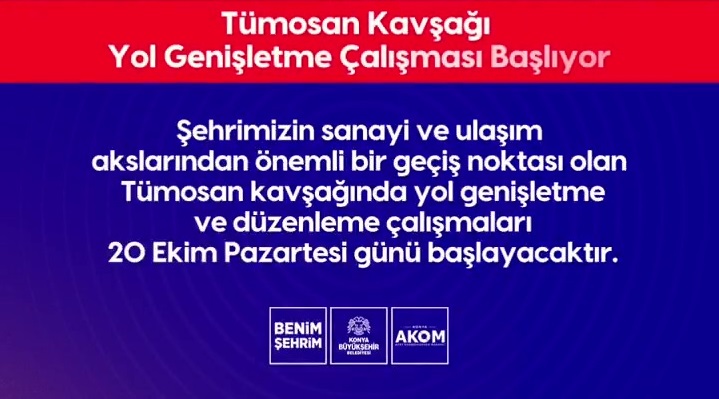 Konya Büyükşehir Belediyesi, Tümosan Kavşağı'nda yürütülecek bu çalışmanın kentin ulaşım altyapısını güçlendireceğini ve şehir trafiğine kalıcı bir rahatlama sağlayacağını vurguladı. Açıklamada, "Bu önemli yatırım sürecinde göstereceğiniz sabır ve anlayış için teşekkür ederiz.” ifadelerine yer verildi.