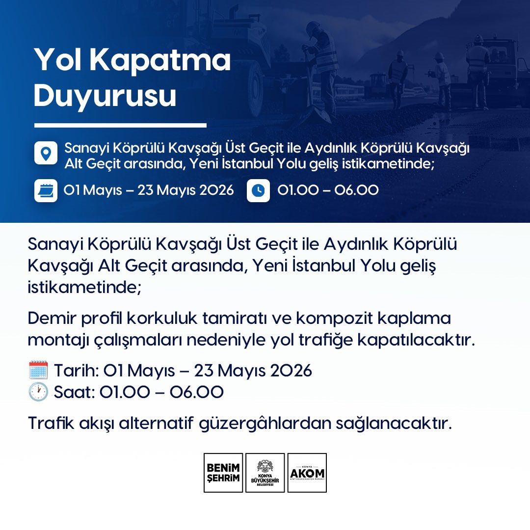 Konya AKOM tarafından yapılan açıklamaya göre, Sanayi Köprülü Kavşağı Üst Geçit ile Aydınlık Köprülü Kavşağı Alt Geçit arasında bulunan Yeni İstanbul Yolu geliş istikameti, yapılacak çalışmalar nedeniyle belirli saatlerde trafiğe kapatılacak.