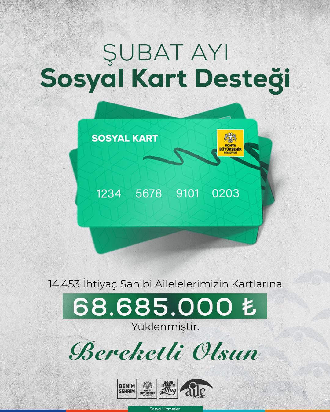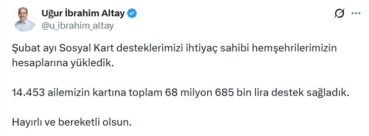 Başkan Altay açıklamasında, "Şubat ayı Sosyal Kart desteklerimizi ihtiyaç sahibi hemşehrilerimizin hesaplarına yükledik. 14.453 ailemizin kartına toplam 68 milyon 685 bin lira destek sağladık. Hayırlı ve bereketli olsun." ifadelerini kullandı.