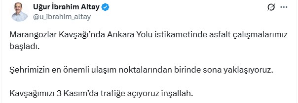 Uğur İbrahim Altay, paylaşımında kavşağın 3 Kasım'da trafiğe açılacağını duyurdu. Çalışmaların planlandığı şekilde ilerlediğini belirten Altay, "Kavşağımızı 3 Kasım'da trafiğe açıyoruz inşallah” ifadelerini kullandı.