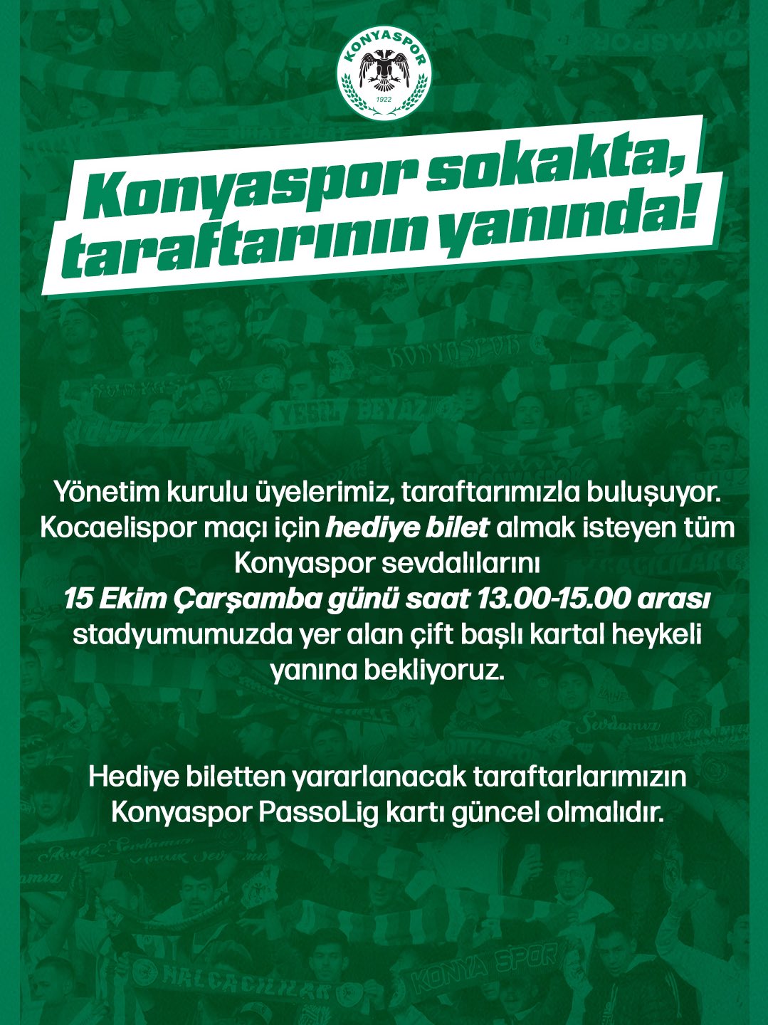 Kocaelispor karşılaşması için hediye bilet almak isteyen tüm Konyaspor sevdalıları, 15 Ekim Çarşamba günü saat 13.00-15.00 arasında stadyumda yer alan çift başlı kartal heykeli yanında buluşacak.