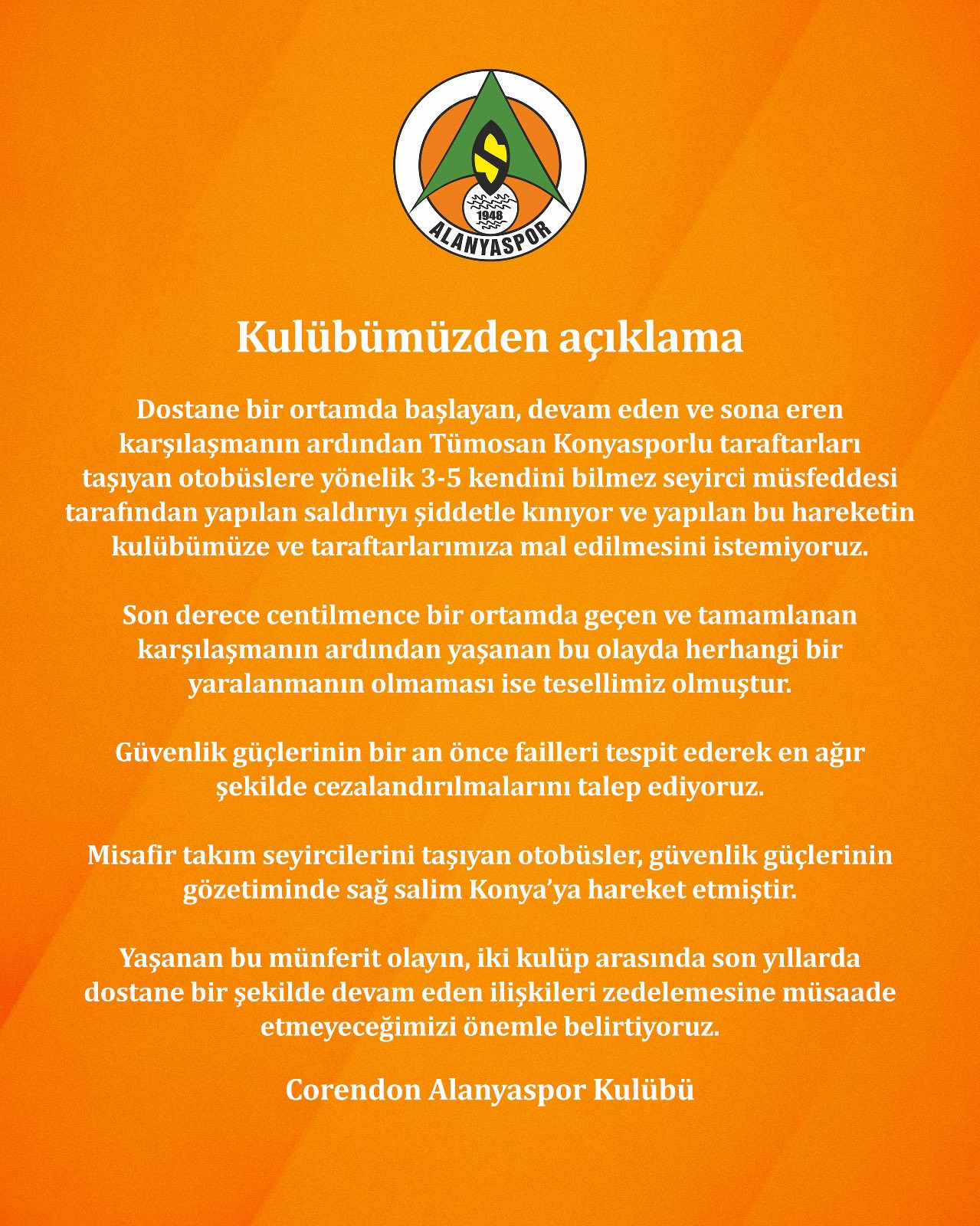 "Dostane bir ortamda başlayan, devam eden ve sona eren karşılaşmanın ardından Tümosan Konyasporlu taraftarları taşıyan otobüslere yönelik 3-5 kendini bilmez seyirci müsfeddesi tarafından yapılan saldırıyı şiddetle kınıyor ve yapılan bu hareketin kulübümüze ve taraftarlarımıza mal edilmesini istemiyoruz.