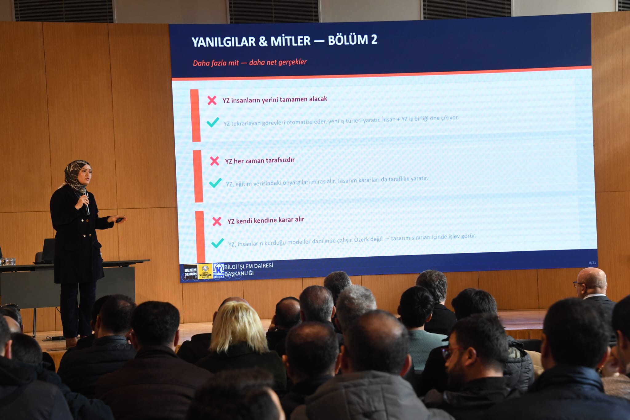 Eğitimin ilk bölümünde, yapay zekânın nasıl çalıştığı detaylı şekilde ele alınırken, kamuoyunda doğru bilinen yanlışlara da açıklık getirildi. Yapay zekânın bir bilinç sistemi olmadığı, aksine veri analizi ve olasılık hesaplamaları üzerinden tahminler üreten bir teknoloji olduğu örneklerle katılımcılara aktarıldı.