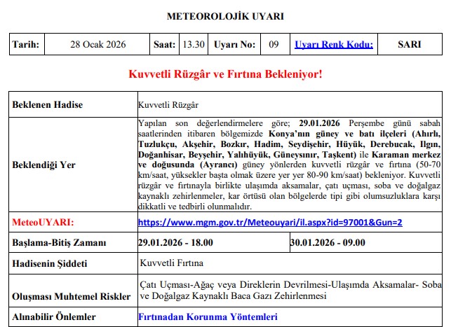 Meteoroloji Genel Müdürlüğü, Konya ve çevresi için sarı kodlu kuvvetli rüzgâr ve fırtına uyarısı yayımladı. Yapılan son değerlendirmelere göre, 29 Ocak Perşembe günü sabah saatlerinden itibaren bölgede etkili olması beklenen fırtınanın günlük yaşamı olumsuz etkileyebileceği belirtildi.