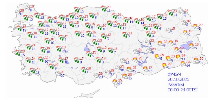 20 Ekim 2025 Pazartesi Konya hava durumu Parçalı Bulutlu, sıcaklık 17°.