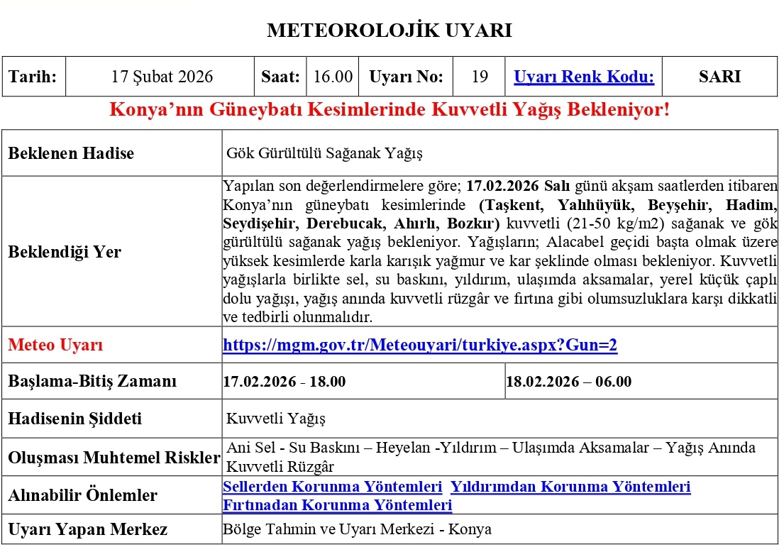 Meteoroloji Genel Müdürlüğü, Konya'nın güneybatı ilçeleri için sarı kodlu meteorolojik uyarı yayımladı. 17 Şubat 2026 Salı (BUGÜN) günü akşam saatlerinden itibaren etkili olması beklenen sağanak ve gök gürültülü sağanak yağışların yerel olarak kuvvetli olacağı bildirildi.