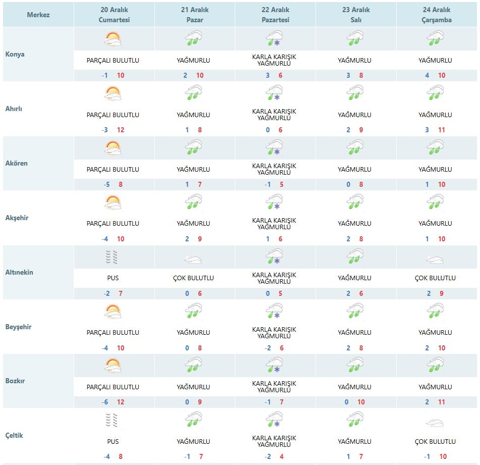 22 Aralık Pazartesi günü Konya'nın bazı ilçelerinde kar yağışı etkili olacak. Ahırlı, Akören, Akşehir, Altınekin, Beyşehir, Bozkır, Çeltik, Çumra, Derbent, Derebucak, Doğanhisar, Güneysınır, Hadim, Halkapınar, Hüyük, Ilgın, Kadınhanı, Karatay, Kulu, Meram, Sarayönü, Selçuklu, Seydişehir, Taşkent, Tuzlukçu, Yalıhüyük ve Yunak ilçelerinde kar yağışı beklenirken, diğer ilçelerde ise sağanak yağışın görüleceği tahmin ediliyor.