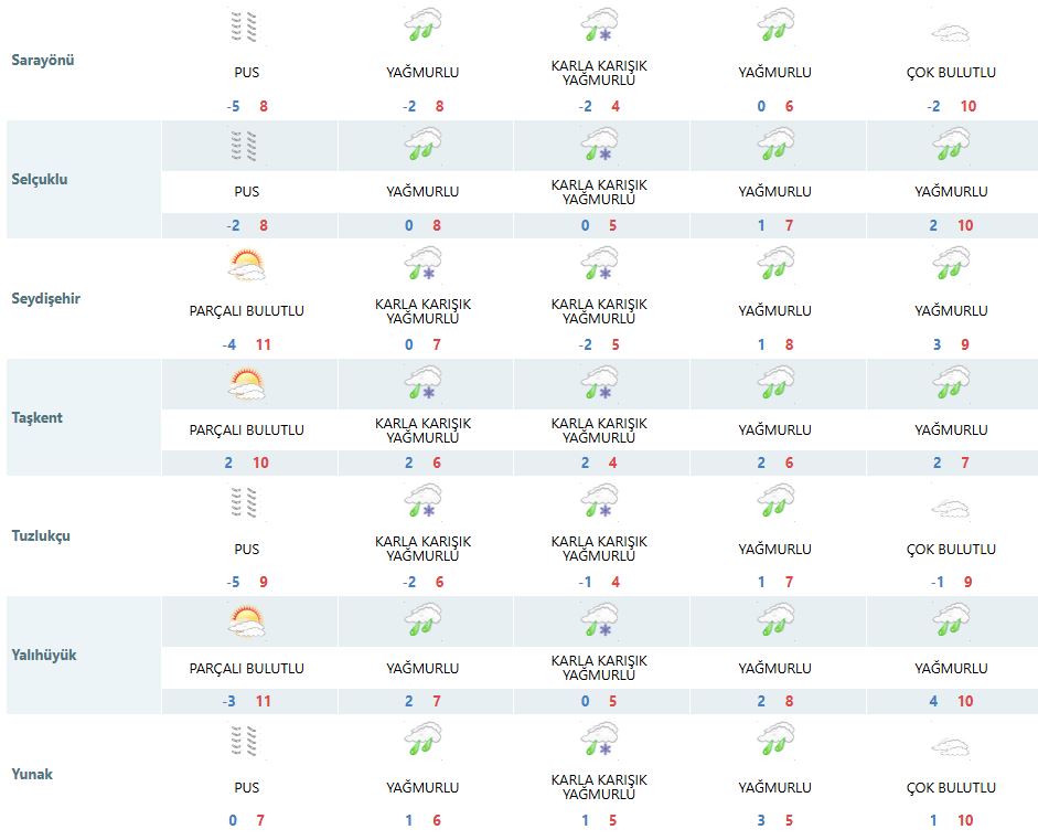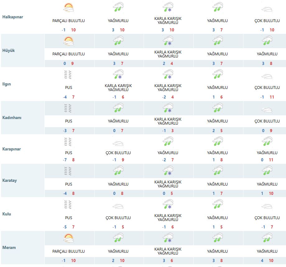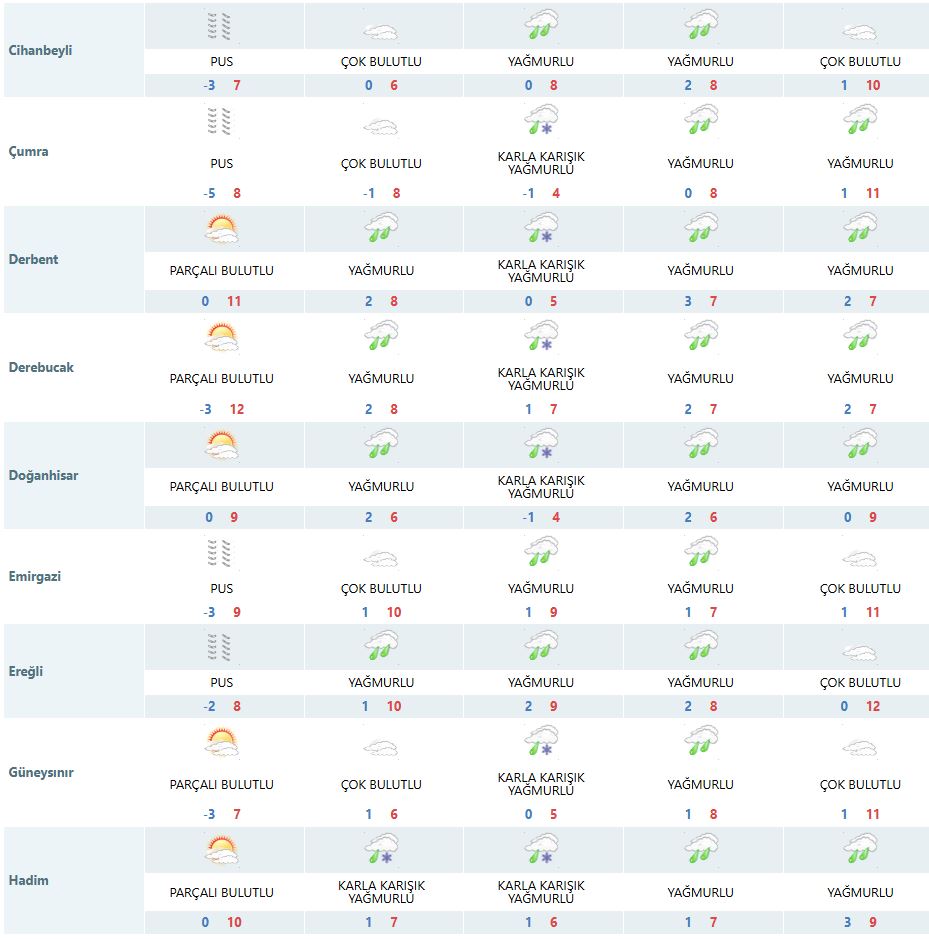 Meteoroloji Genel Müdürlüğü, Konya'nın merkez ilçesi dahil olmak üzere 31 ilçeyi kapsayan beş günlük hava tahmin raporunu yayımladı.