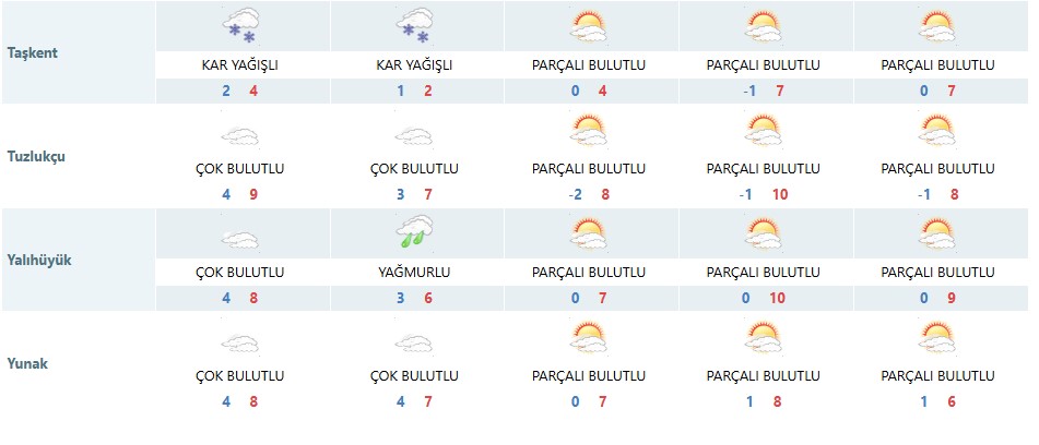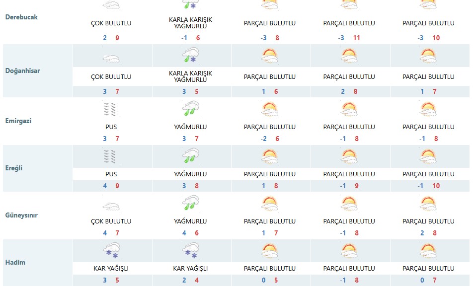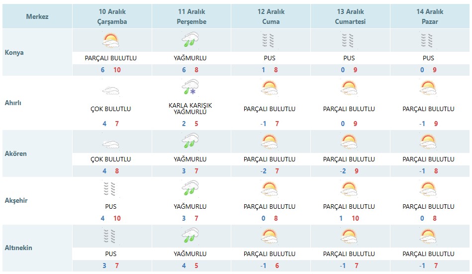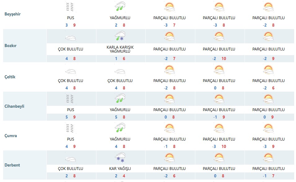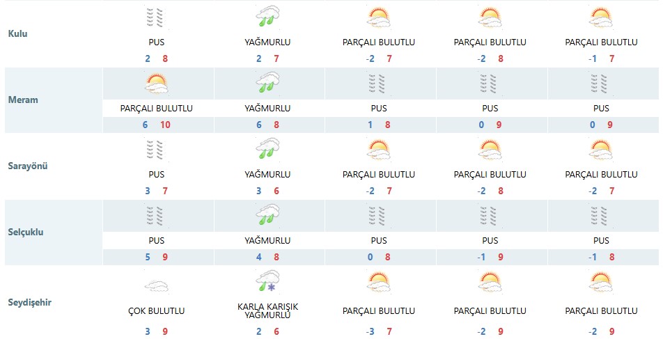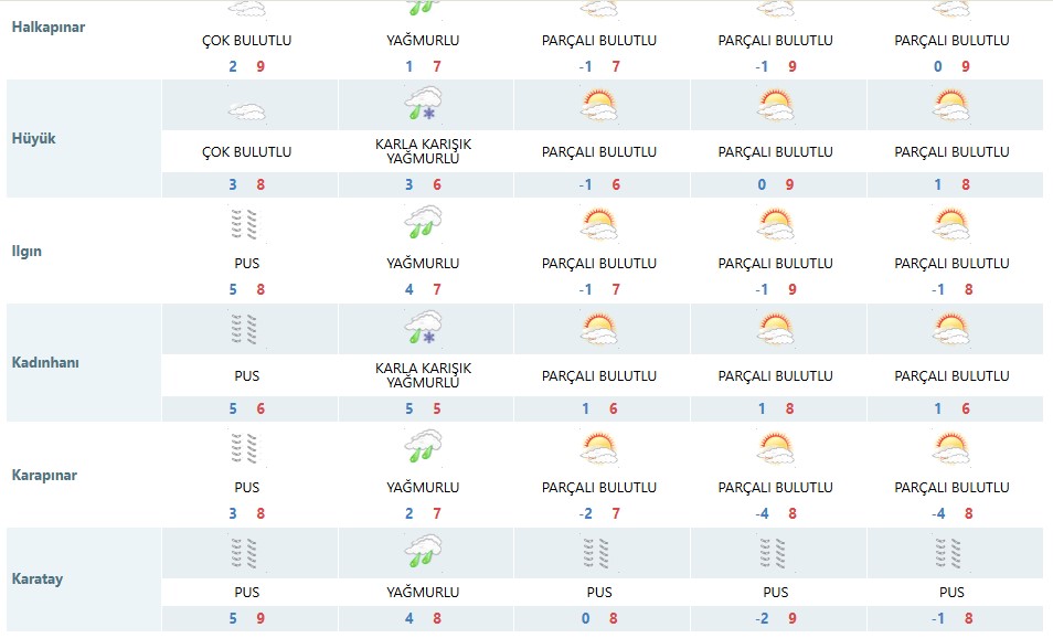 Meteoroloji Genel Müdürlüğü, Konya merkez ve 31 ilçe için beş günlük hava tahmin raporlarını yayımladı. Açıklanan verilere göre kent genelinde hafta sonuna kadar puslu ve yer yer soğuk hava hâkim olacak. Bazı ilçelerde gece sıcaklıklarının -3 ile -4°C seviyelerine kadar düşmesi beklenirken, gündüz sıcaklıkları ise 6 ile 9°C arasında değişecek.
