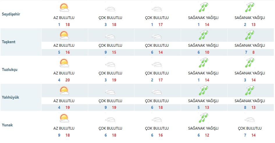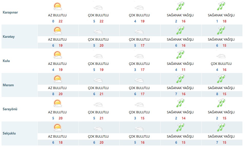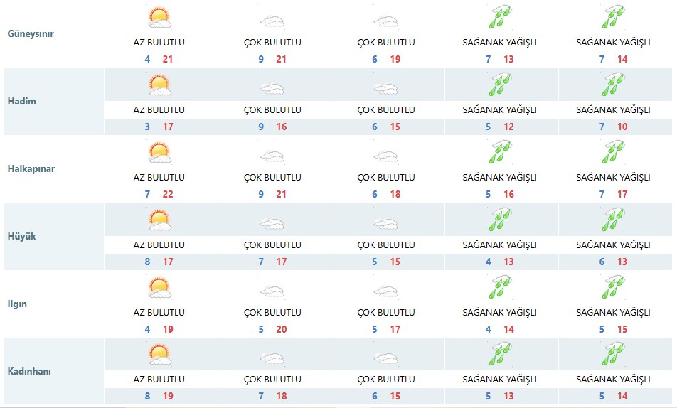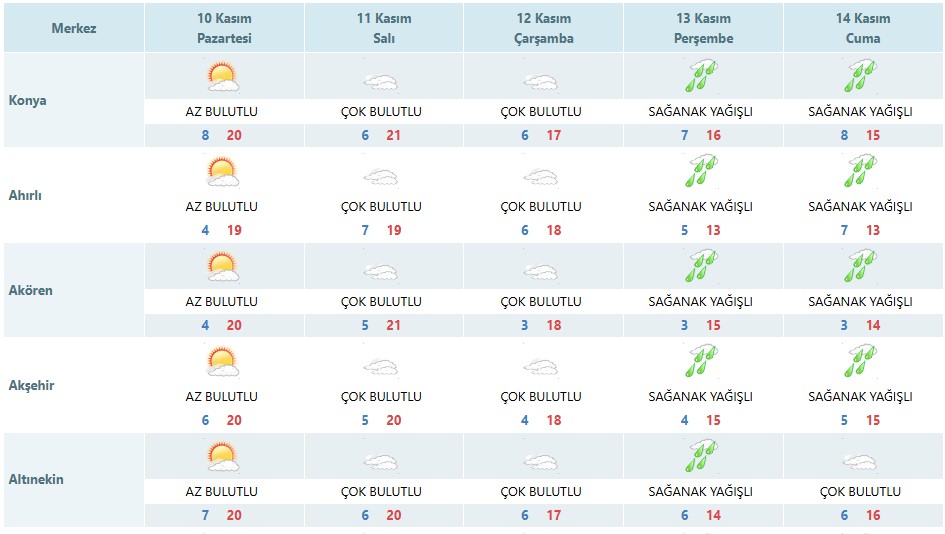Konya'da hafta ortasından itibaren yağışlı hava etkili olacak. Meteoroloji verilerine göre kentte 13 Kasım Perşembe ve 14 Kasım Cuma günü sağanak yağış bekleniyor. Hafta başında 20-21 derece civarında seyreden hava sıcaklıklarının, yağışla birlikte 15 dereceye kadar düşeceği tahmin ediliyor.