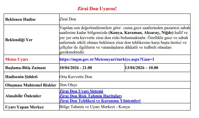 Yetkililer, yaşanabilecek don olaylarının tarım ürünlerine zarar verebileceğine dikkat çekerek Konyalı çiftçilere tedbir çağrısında bulundu. Ürünlerin korunması için gerekli önlemlerin alınması ve resmi uyarıların yakından takip edilmesi gerektiği bildirildi.